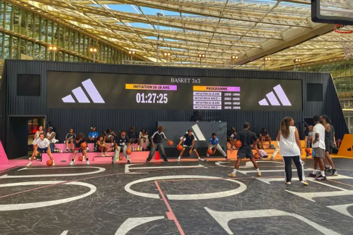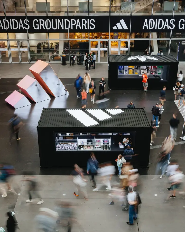 L’expérience immersive imaginée pour Adidas Ground Paris mêle sport et design. Elle s’articule autour de volumes géométriques simples et puissants, murs en tôle ondulée noirs, écrans LED monumentaux et iconographie Adidas épurée.