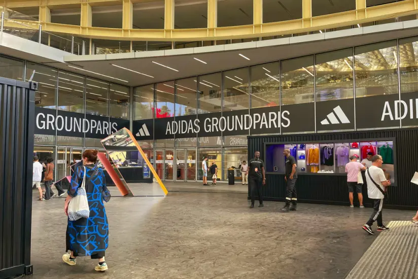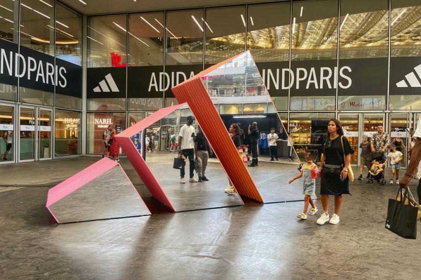 À l’extérieur, une installation sculpturale à l’image de l’iconique logo Adidas crée un repère visuel fort et une zone de rencontre informelle. Autour, la circulation fluide et les vitrines ouvertes sur la boutique Adidas Ground favorisent une transition douce entre performance sportive et expérience lifestyle.