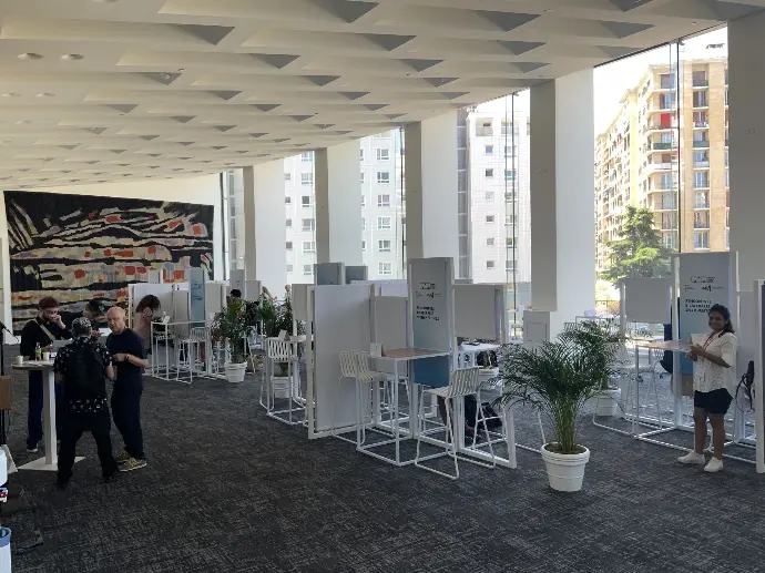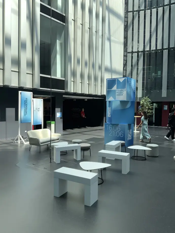 Pour accompagner cette ambition, la scénographie a été pensée comme une extension visuelle de l’identité graphique de l’événement. Elle s’articule autour de la transformation du logo en volumes : cubes et totems en 3D, servant d’éléments structurants dans l’espace. Le décor en arrière-plan, composé de formes simples, joue avec un dégradé de couleurs et un liseré blanc, apportant clarté et cohérence visuelle aux prises de parole. Des kakémonos réversibles, suspendus sur des châssis blancs, rythment les différents temps forts et offrent une modularité scénographique adaptée aux besoins de l’événement.