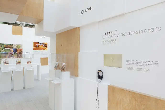Conçu pour la COP21 au Grand Palais, le pavillon L’Oréal illustre l’engagement du groupe en matière de développement durable à travers une scénographie épurée et pédagogique. L’espace structuré par des volumes cubiques blancs et des inserts en bois clair évoque la pureté. Des vitrines minimalistes, dispositifs interactifs et écrans intégrés guident le visiteur dans une expérience immersive et sensorielle autour des innovations de la marque.