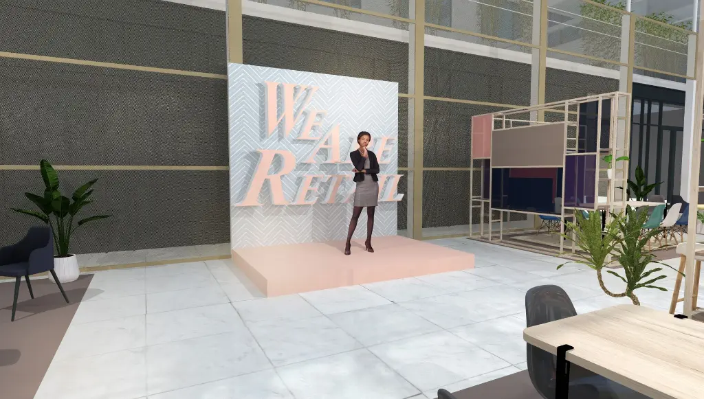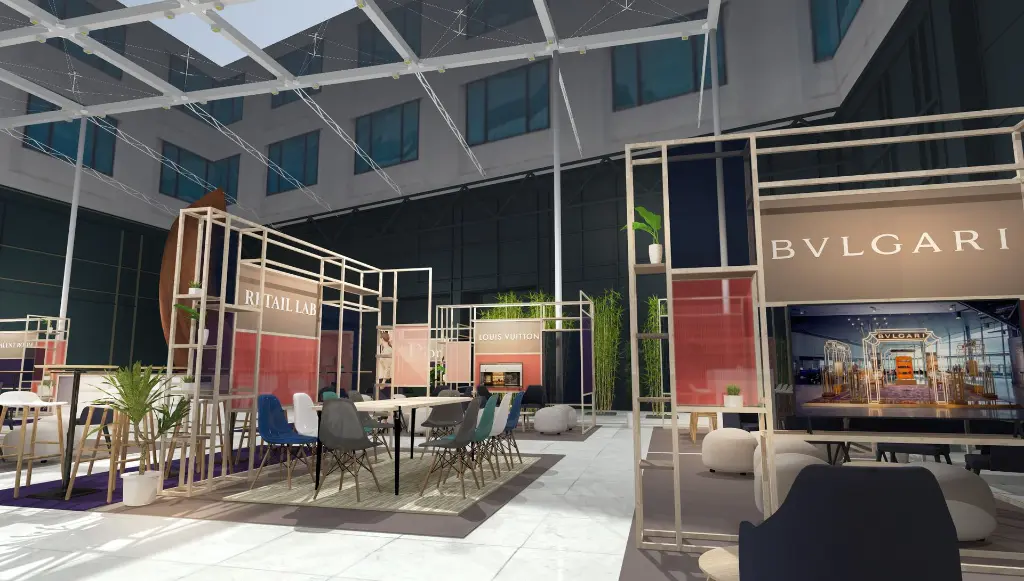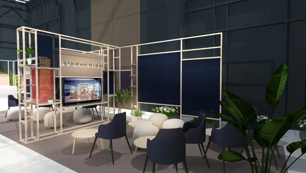 Des structures légères en bois, avec un design minimaliste viennent entourer des zones dédiées à chaque marque. On y trouve un environnement épuré avec une décoration douce , dominée par des tons de rose et de bleu.