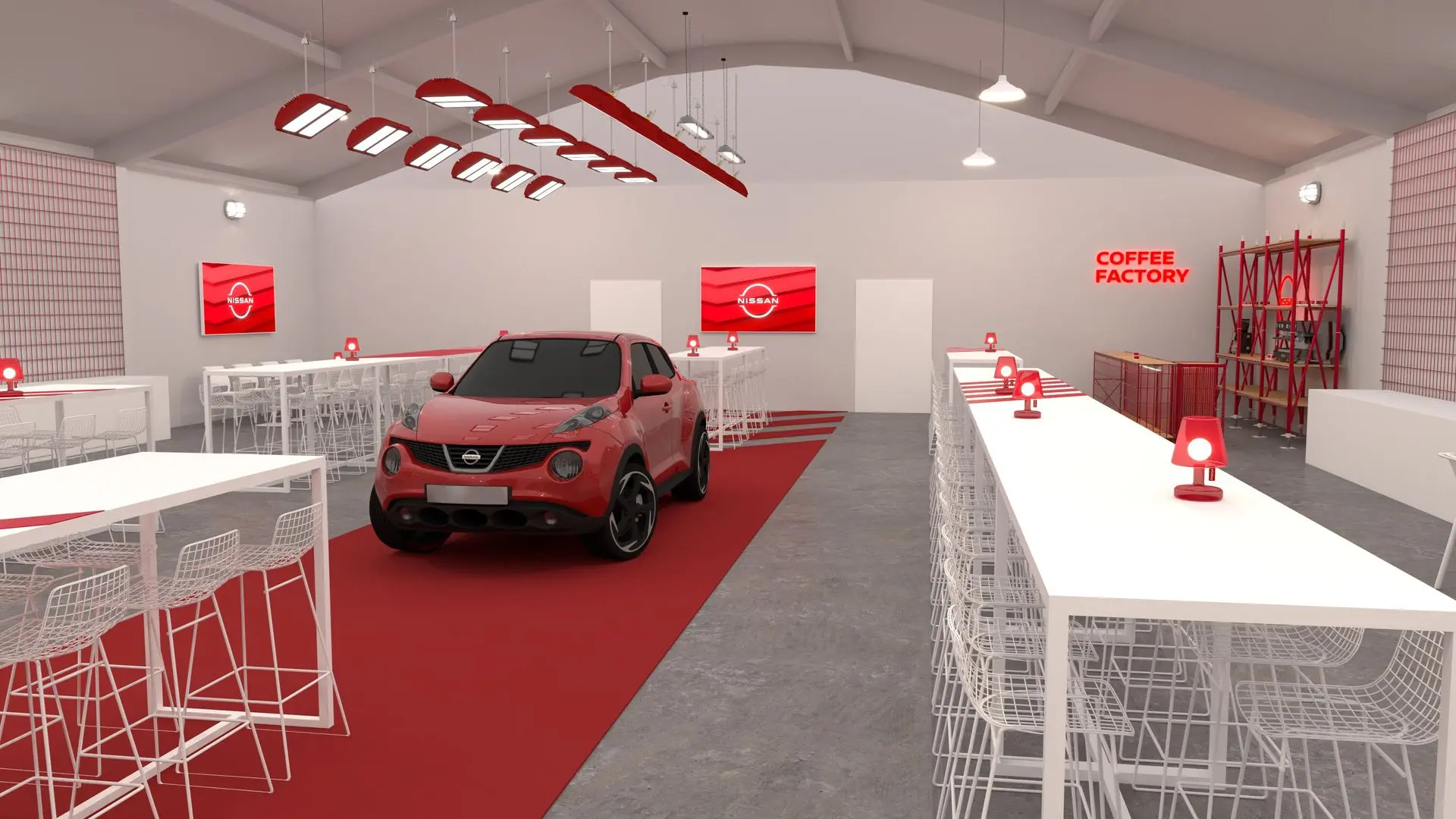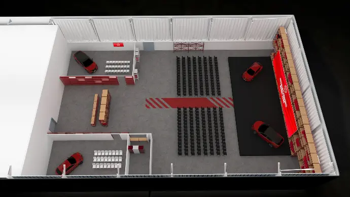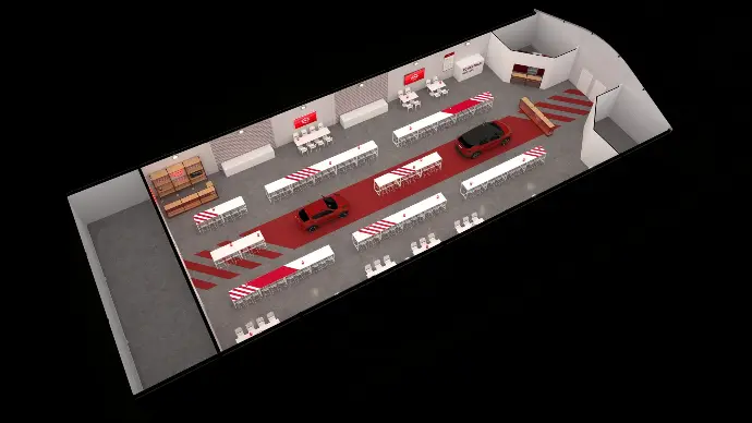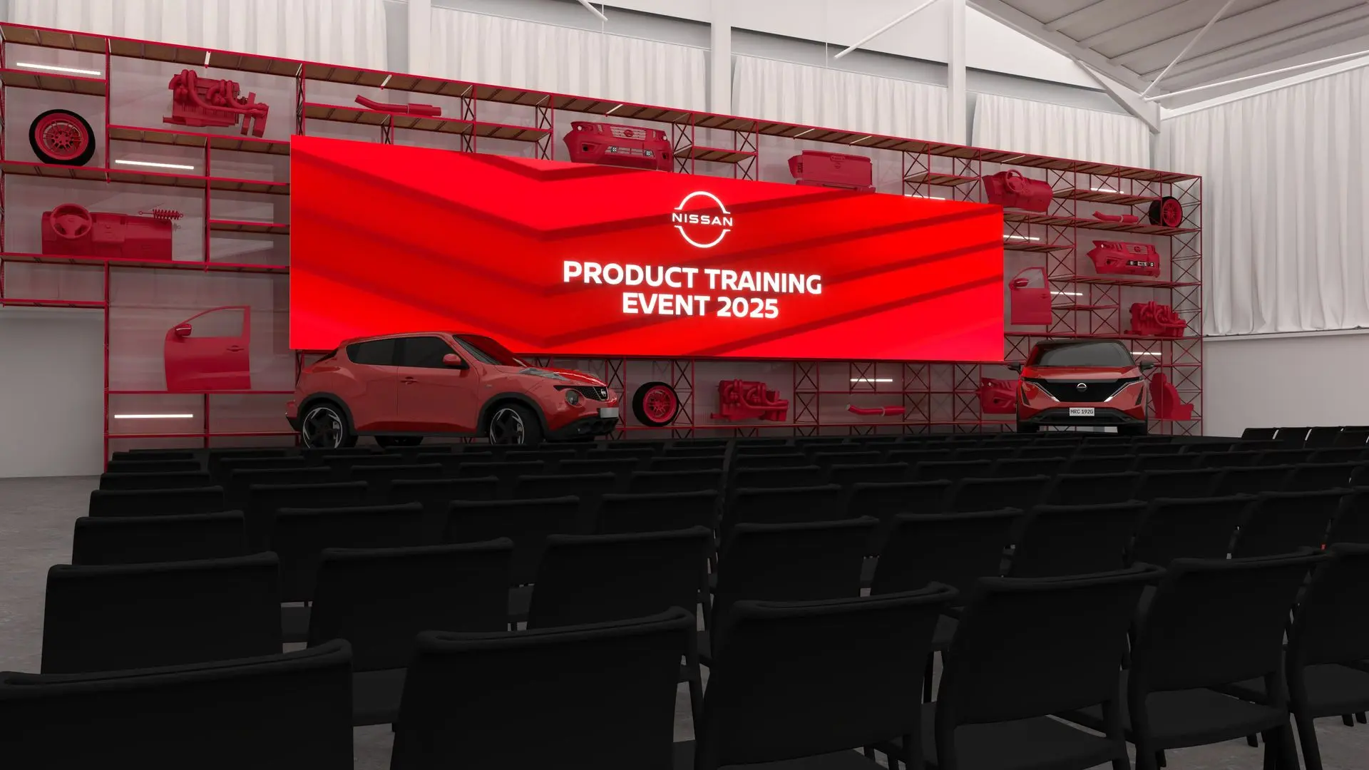 Pour ce training événementiel organisé par Nissan, la scénographie repose sur un concept fort : immerger les participants dans l’univers technique et visuel de la marque. Le décor de fond, entièrement modulé à partir de structures tubulaires rouges, sert à la fois de support visuel et de vitrine produit. Il intègre des éléments emblématiques de l’univers automobile – pièces mécaniques, éléments de carrosserie, jantes, volants, tous présentés dans une teinte monochrome rouge, créant un effet muséographique à fort impact visuel.