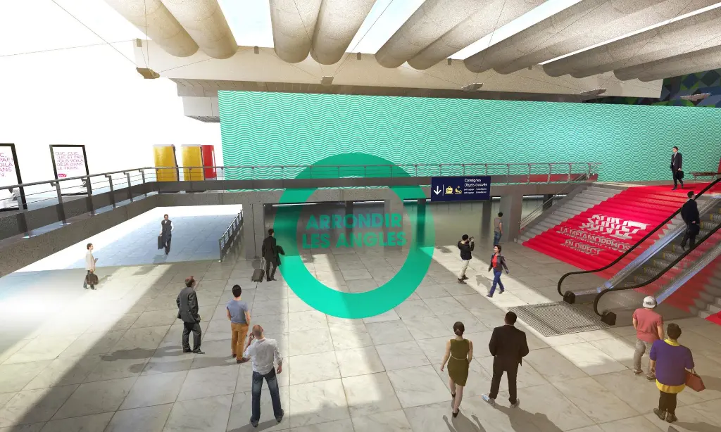 Les volumes bruts de la gare sont sublimés par des jeux de couleurs, de typographie et de lumière qui guident les flux et créent un dialogue entre architecture et voyageurs.