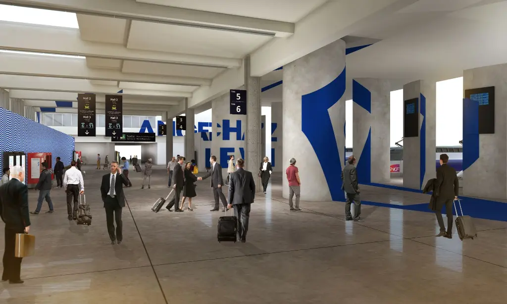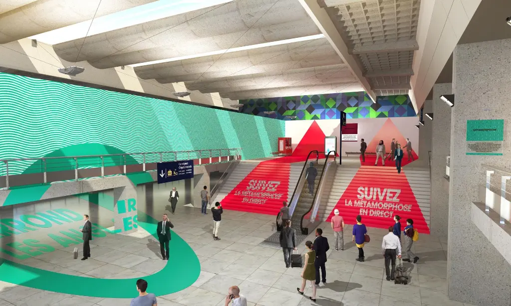 L’espace a été repensé comme une expérience visuelle et participative : signalétique monumentale, anamorphose et installations interactives incitent les voyageurs à « suivre la métamorphose en direct ».